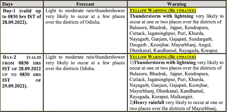 Yellow warning for heavy rainfall has been issued for one or two places in Gajapati, Malkangiri and Koraput on September 29. Thunderstorm with lightning alert has also been sounded for one or two places in Balasore, Bhadrak, Jajpur, Kendrapada, Cuttack, Jagatsinghpur, Puri, Khurda, Nayagarh, Ganjam, Gajapati, Mayurbhanj, Kandhamal, Kalahandi, Rayagada, Nabarangpur, Malkangiri and Koraput districts.