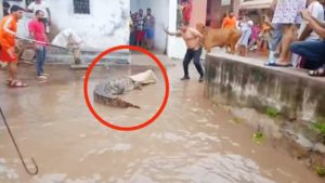 Jajpur: A widely-circulated video on social media, showing a group of people trying to tackle a crocodile which has made its way into a waterlogged residential neighbourhood, has left many petrified.