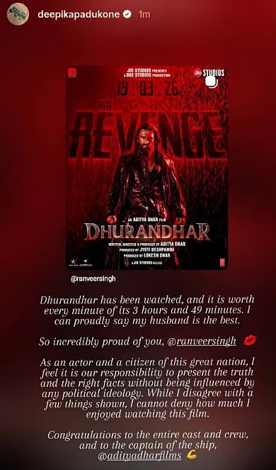 The viral Instagram story read, “Dhurandhar has been watched, and it is worth every minute of its 3 hours and 49 minutes. I can proudly say my husband is the best. So incredibly proud of you, @ranveersingh.”