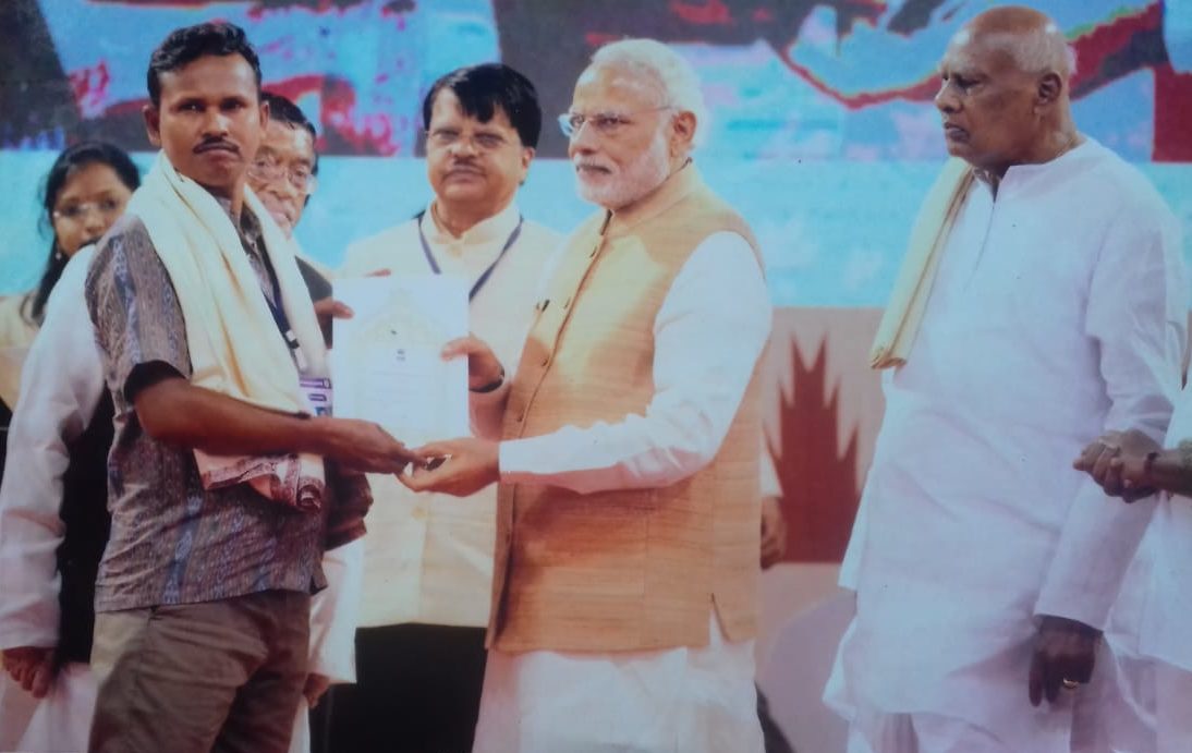 The dialogue from the movie ‘Om Shanti Om’ – Itni shidaat se main tumhe paane ki koshish ki hai, ke har zarre ne mujhe tumse milane ki saazish ki hai – fits well here. In August 2015, Biswanath travelled all the way to Chennai to receive the National Award for outstanding skill and contribution to the development of handloom with his Tie and Dye Silk Saree ‘Maa’ from Prime Minister Narendra Modi at the University of Madras.