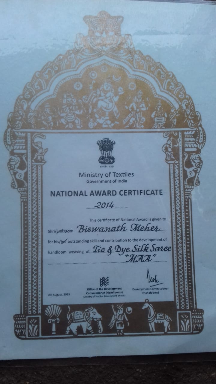 It took Biswanath almost two-and-a-half month to weave the first piece of art. “It was in late 2014 or early 2015. My father Rasananda Meher, a relative and Shankar Meher helped me create the bandh, which was then dyed. I applied for the award through the Assistant Director of Textiles office in Sonepur and the saree was then sent to Delhi via Weavers’ Service Centre, Guwahati,” he said.