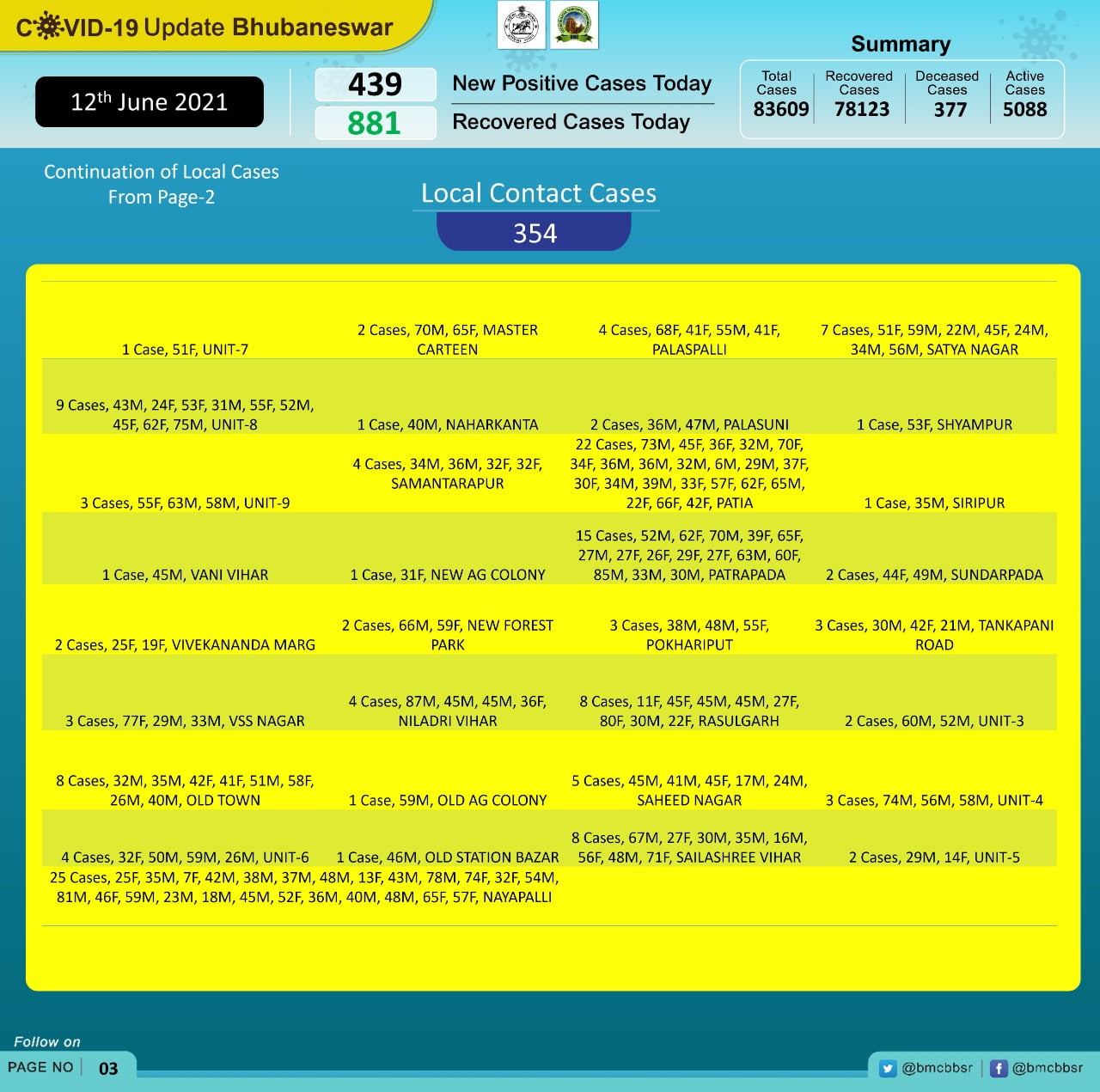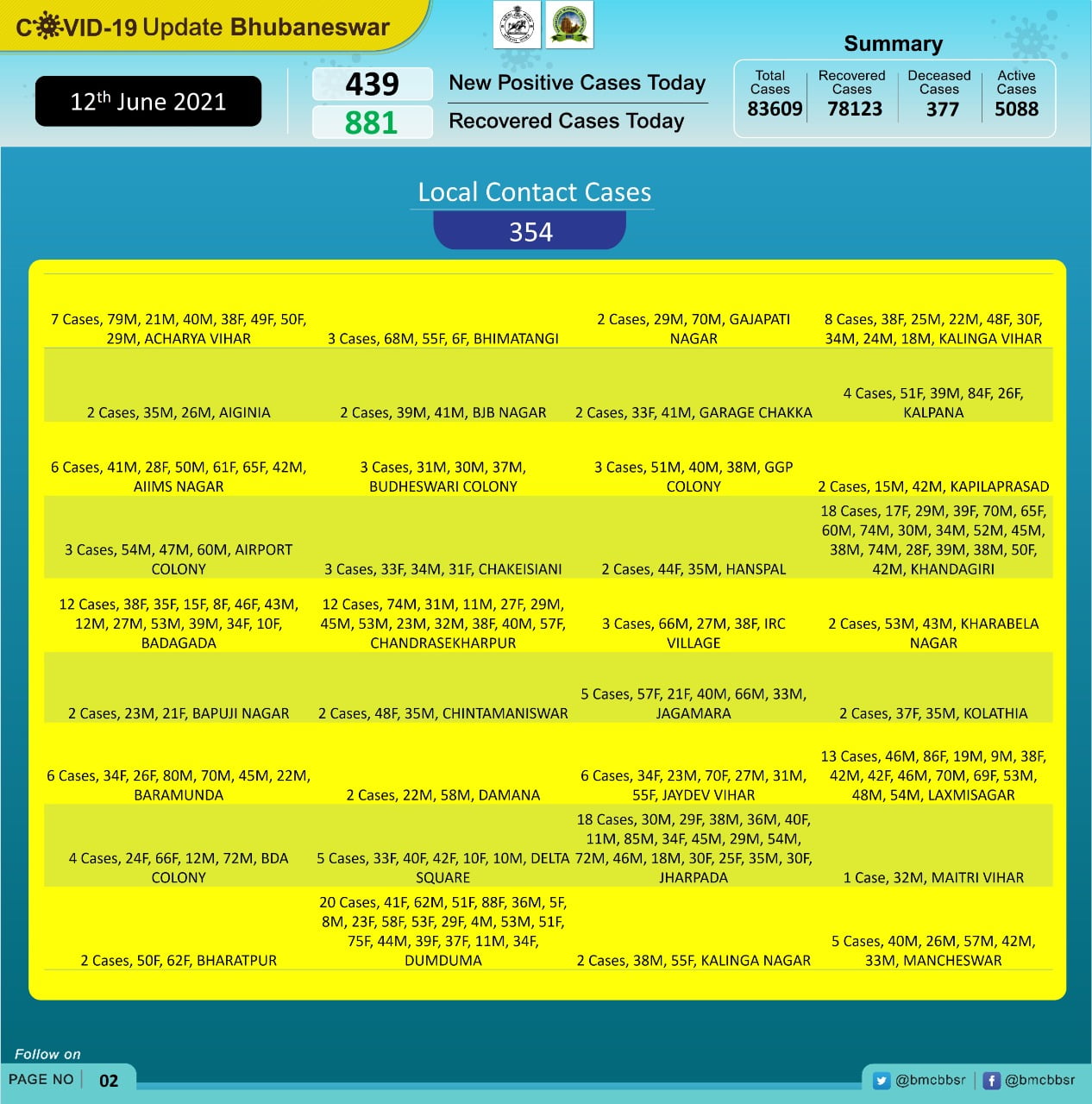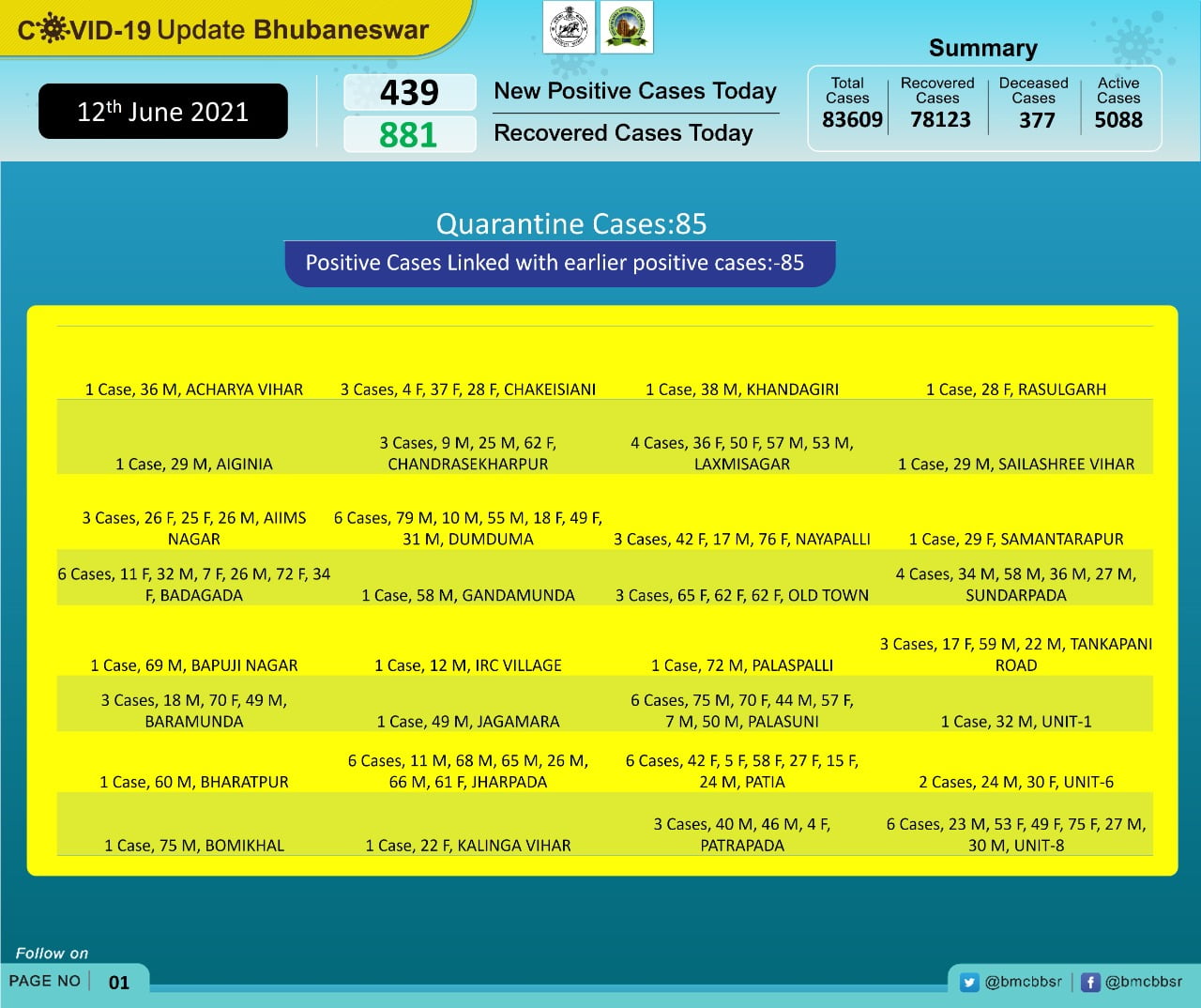 Among new cases, 85 are from quarantine and 354 through local contacts. The total number of cases in Bhubaneswar has now gone up to 83,609.