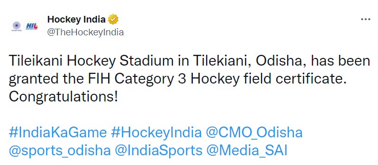 The Hockey India, in a tweet, said, “Tileikani Hockey Stadium in Tilekiani, Odisha, has been granted the FIH Category 3 Hockey field certificate. Congratulations!”