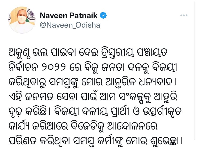 Earlier in the day, BJD president and Chief Minister Naveen Patnaik on Tuesday thanked the people of Odisha for their overwhelming support, which reduced the main challenger BJP to the fringes.