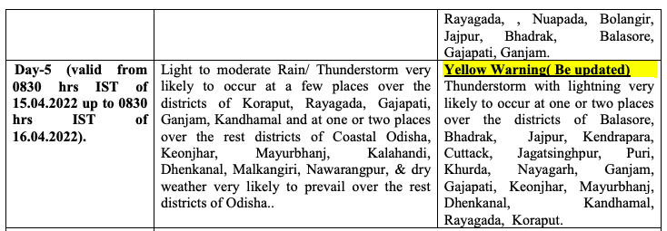 Rain, thunderstorm and lightning are also likely in some parts of Koraput, Balangir, Nuapada, Kalahandi, Gajapati, Khurda (including Bhubaneswar), Keonjhar, Puri, Jajpur, Nayagarh and Cuttack (including Cuttack city), during this period.