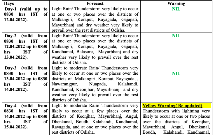 Rain, thunderstorm and lightning are also likely in some parts of Koraput, Balangir, Nuapada, Kalahandi, Gajapati, Khurda (including Bhubaneswar), Keonjhar, Puri, Jajpur, Nayagarh and Cuttack (including Cuttack city), during this period.