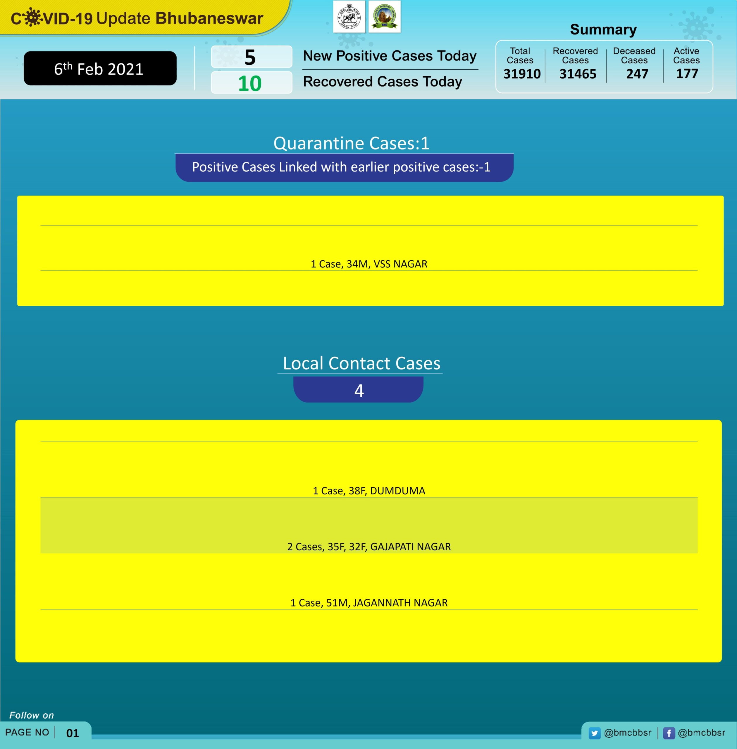 Bhubaneswar: Five new Covid-19 positive cases were reported in the city in the last 24 hours, Bhubaneswar Municipal Corporation (BMC) informed on Saturday.