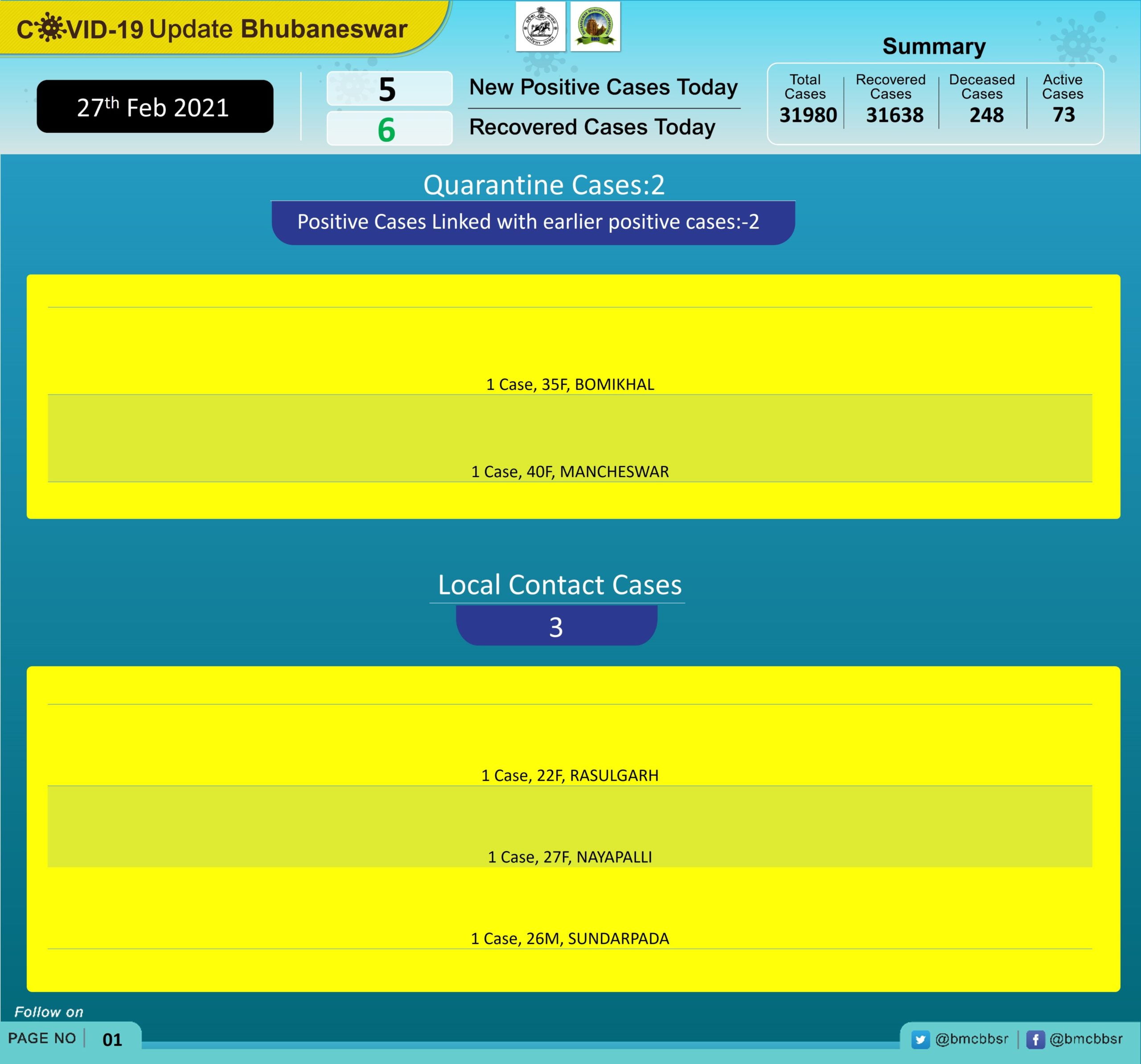 Of them, two are from quarantine and three are local contacts, informed Bhubaneswar Municipal Corporation (BMC) on Saturday.