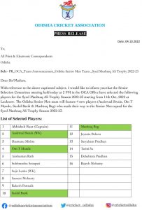 Cuttack: The Odisha Cricket Association (OCA) has announced the squad for the upcoming Syed Mustaq Ali Trophy to be held in Lucknow from October 11.