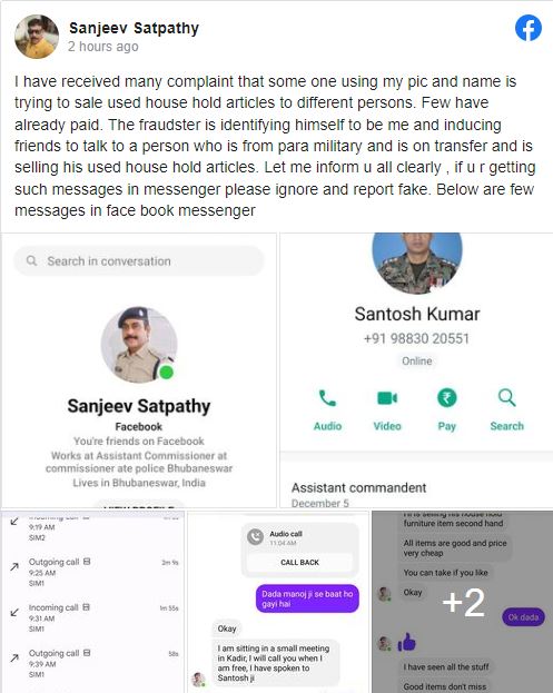 The fraudster is identifying himself as ACP Satpathy and inducing friends to talk to a person who is from the Indian army and wants to sell his used household articles following his transfer.