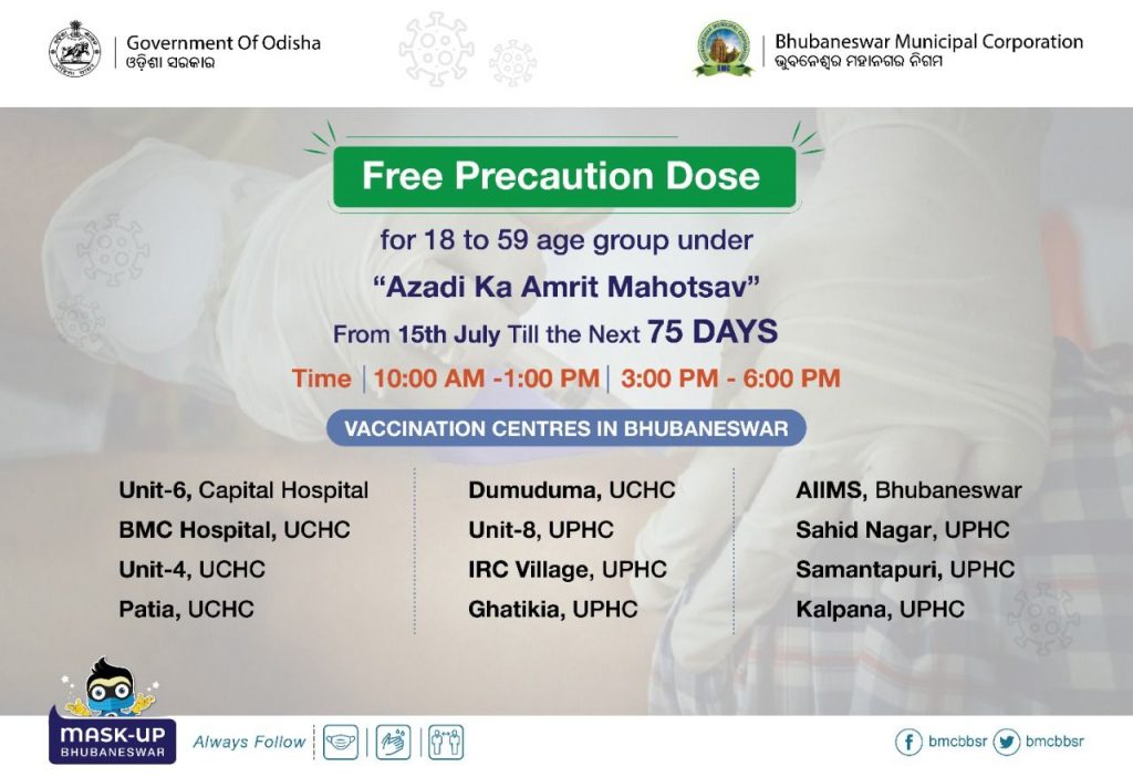 In Bhubaneswar, the doses will be administered at 12 vaccination centres from 10 am to 1 pm and 3 pm to 6 pm. The drive, which is aimed at boosting the uptake of COVID precaution doses, will begin at the Urban Community Health Centre, Unit 4, at 10 am in presence of Bhubaneswar Municipal Corporation (BMC) Commissioner Vijay Amruta Kulange and Health and Family Welfare director Bijay Kumar Panigarhi.