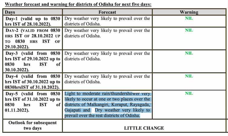 “Light to moderate rain/thundershower is very likely at one or two places in Malkangiri, Koraput, Rayagada and Gajapati between 8.30 am on October 31 to 8.30 am on November 1 while dry weather is expected over the rest of Odisha,” it said.