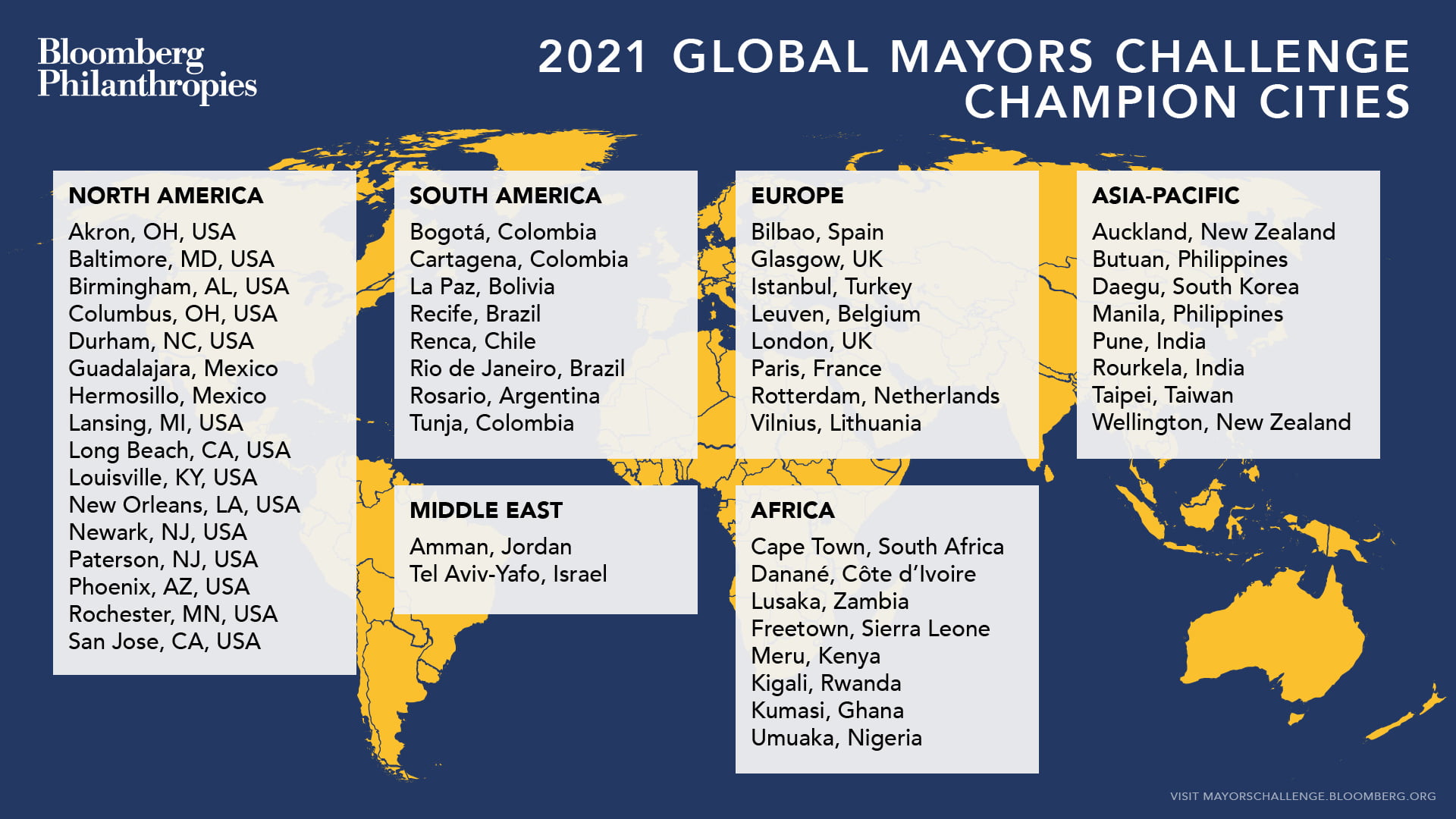 From June 23 through October, the 50 finalist cities will refine their ideas with technical assistance from Bloomberg Philanthropies and its network of leading innovation experts. Fifteen of the 50 cities will ultimately win the grand prize, with each receiving $1 million and robust multi-year technical assistance to implement and scale their ideas. The winners will be announced in early 2022.
