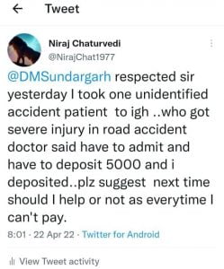 In a tweet to Sundargarh collector, Niraj informed about the incident and sought his intervention. “Plz suggest next time should I help or not as everytime I cannot pay,” he said.