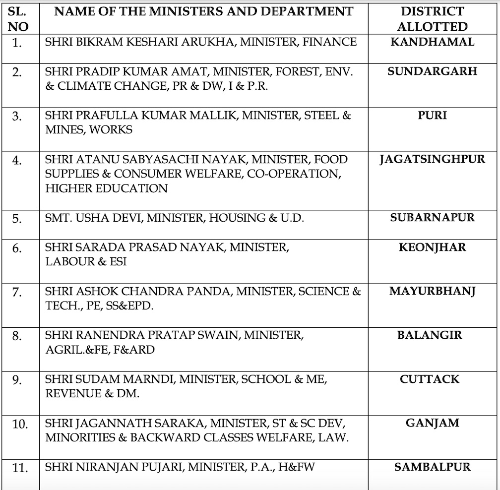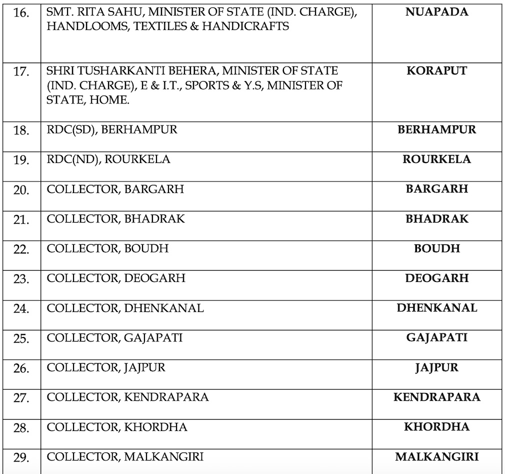 The CMO office on Sunday released the list of ministers and other dignitaries, who will unfurl and take salute at different places in the state on January 26. Ministers has been assigned the responsibility in 17 districts. RDCs will unfurl Triclour in Berhampur and Rourkela and collectors in the remaining districts headquarters.