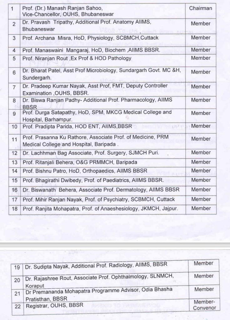 The 22-member committee is headed by Prof Manash Ranjan Sahoo, vice-chancellor, Odisha University of Health Sciences (OUHS), Bhubaneswar, according to an order of Health and Family Welfare department, issued on Thursday.