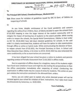 Bhubaneswar: The state government on Wednesday issued a show-cause notice to the DAV School, Chandrasekharpur in the city for violating the guidelines on reopening the schools.