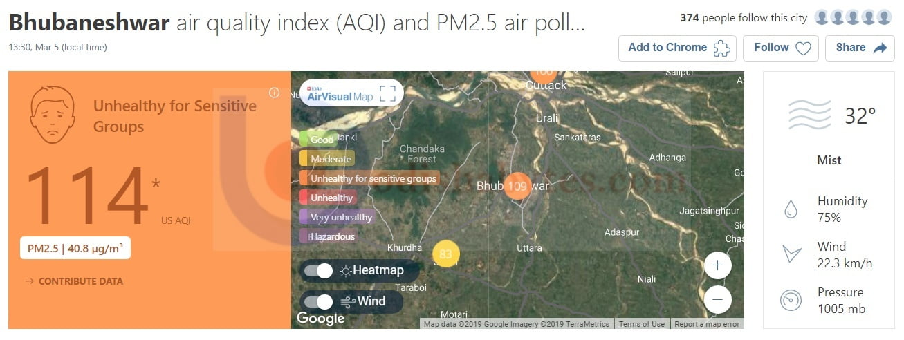The current Air Quality Index (AQI) in Bhubaneswar is around 114, which is ‘unhealthy for sensitive people’ according to IQAir site. The same is 157 (Unhealthy) in New Delhi with a peak of 257 (Very unhealthy) near Wazipur.