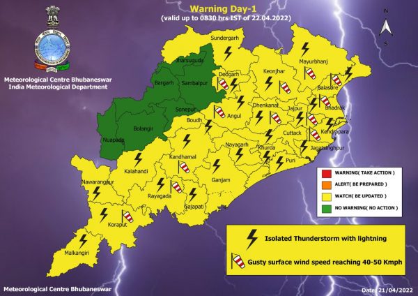 Thunderstorm with lightning is also very likely to occur at one or two places over the districts of Cuttack, Jagatsinghpur, Puri, Khurda, Nayagarh, Ganjam, Gajapati, Sundargarh, Boudh, Kalahandi, Malkangiri and Nabarangpur.