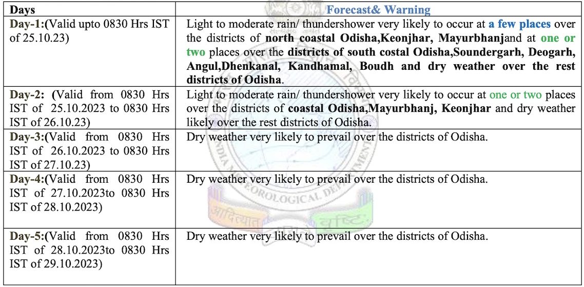 The IMD further informed that squally wind speed reaching 40-50 kmph gusting to 60 kmph is likely till October 24 and decrease thereafter. Sea conditions to remain rough to very rough till October 25. Fishermen have been advised not to venture into sea along and off Odisha coast and westcentral &North Bay of Bengal till October 25. Distant warning Signal No-2 (DW-2) has been hoisted at all ports of Odisha.