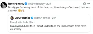 When an X user pointed out that Rathee had previously praised Anurag Kashyap’s ‘Gangs of Wasseypur’, a film also known for violence, the content creator responded, “I was wrong, back then I didn’t understand the impact such films have on society.”