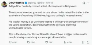 Hours after the trailer release of ‘Dhurandhar’, Dhruv took to his X handle (now called Twitter) on Tuesday and wrote, “Aditya Dhar has truly crossed a limit of cheapness in Bollywood. The extreme violence, gore and torture shown in his latest film trailer is the equivalent of watching ISIS beheadings and calling it “entertainment”.”