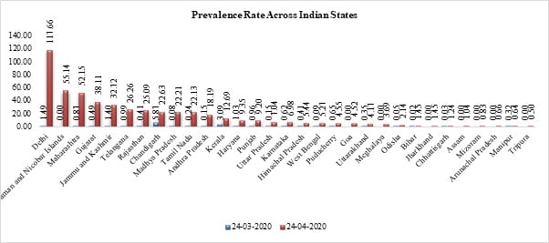 By looking at the prevalence rate across major Indian states, we found that the rate increased manifold during the said one month period. From the beginning of Lockdown 1.0, the COVID-19 positive cases increased from 562 to 23456 till April 24. States such as New Delhi, Maharashtra, Gujarat, Jammu & Kashmir, Telangana, Rajasthan and others showed manifold increase in coronavirus cases. Although due to various policy measures by various state governments such as Odisha, Kerala, Uttar Pradesh and others the rate of increase in positive cases was less but in other states the rate of increase in COVID-19 cases was very high. States such as Maharashtra, Delhi and Gujarat comprise the major increase in the COVID-19 cases in India. During the first 30 days of the nationwide lockdown, the total coronavirus cases prevalence rate increased from 0.02 per one million to 2.14 per one million.