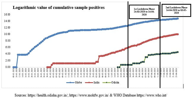 The logarithmic cumulative coronavirus cases in India showed that since March 24, the numbers of coronavirus positive cases increased. The curve was flat from February 2 to February 29, afterwards the number of cases increased, while at the global level the increase is more due to the increasing number of coronavirus cases in USA and European countries. The cumulative number of positive cases is still at increasing in India. In Odisha, the rate of increase in the cumulative coronavirus positive cases was still in flat shape after two significant increases on April 3 and April 5 and then 13 cases on a single day on April 20.