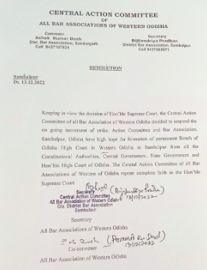 “Keeping in view the decision of Hon’ble Supreme Court, the Central Action Committee of all Bar Associations of Western Odisha decided to suspend the ongoing movement of strike,” the Central Action Committee said in a resolution.