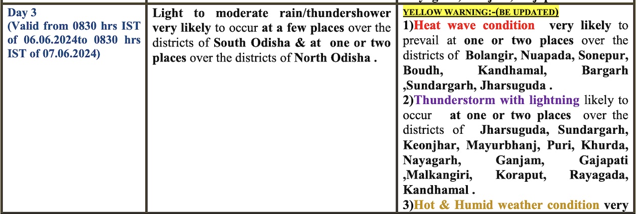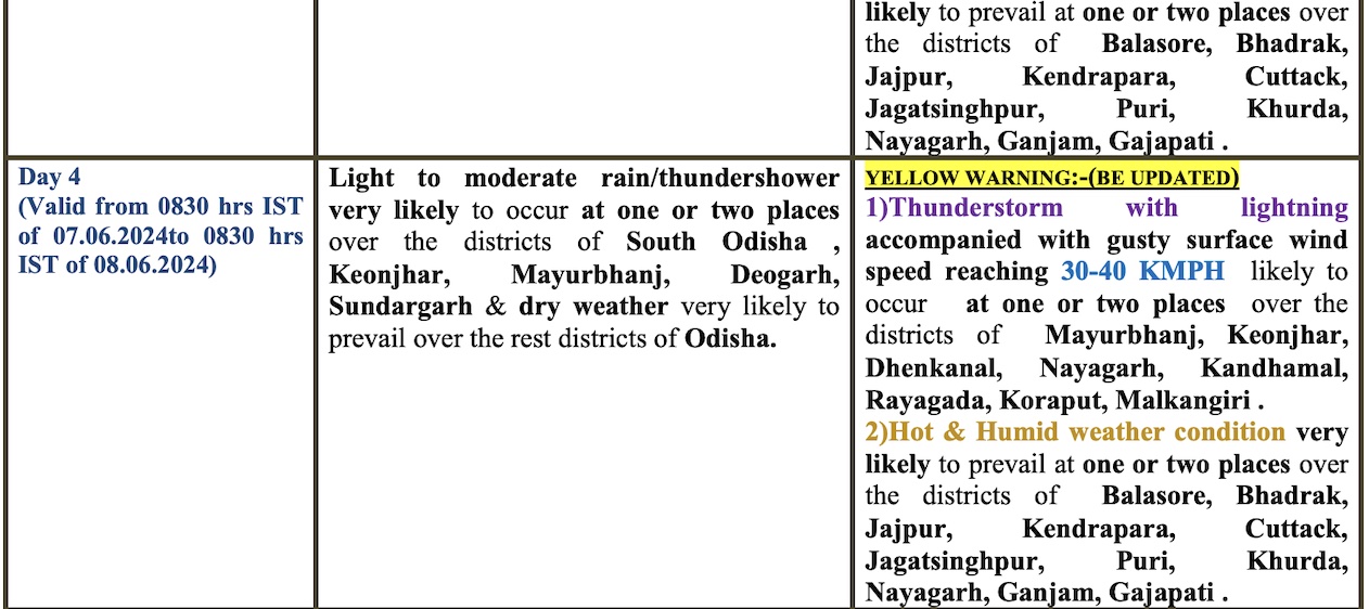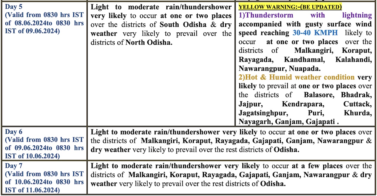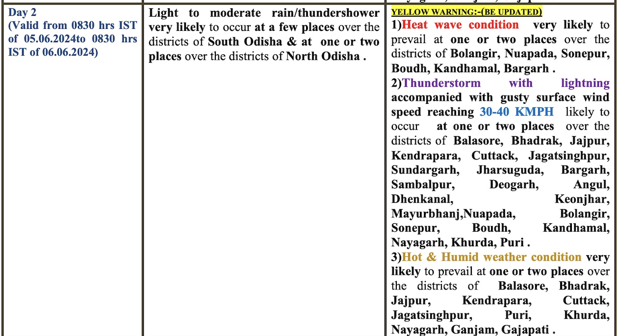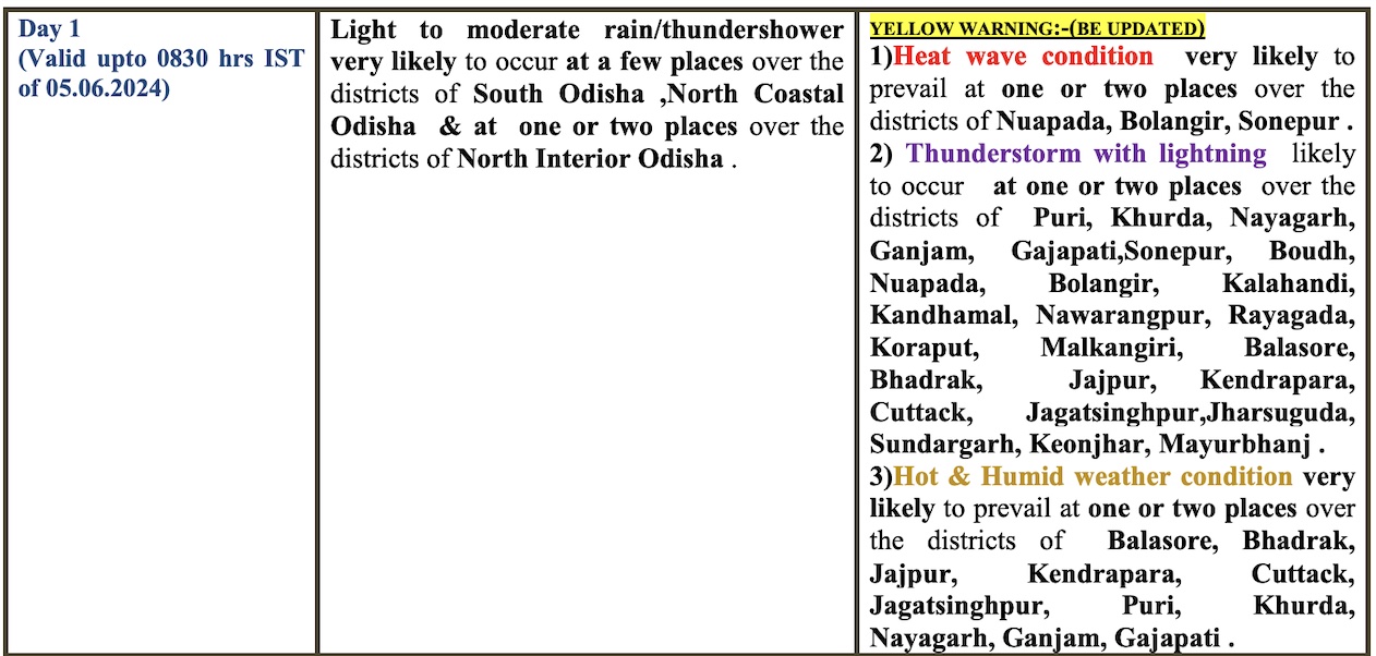 It further stated that heatwave is likely to persist in western districts of the state till June 6 while hot and humid conditions may prevail in Balasore, Bhadrak, Jajpur, Kendrapada, Cuttack, Jagatsinghpur, Puri, Khurda, Nayagarh, Ganjam, and Gajapati districts till June 8. Several places in the state are also likely to experience thunderstorm with lightning accompanied by gusty surface wind speed reaching 30-40 kmph till June 8.