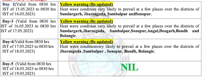 “Westerly/northwesterly winds and high solar insolation, maximum temperature (Day Temperature) is very likely to rise by 3 to 5°C during next 2 days at many places over Odisha. Consequently, heatwave condition is likely in some districts of interior Odisha from May 15 and also maximum temperature (Day Temperature) likely to be more than 40°C and above normal by 3 to 5°C at a few places over the districts of Odisha. People are advised to take precautionary measure while going outside during day time between 11 am and 2 pm,” the MeT office in its midday bulletin.