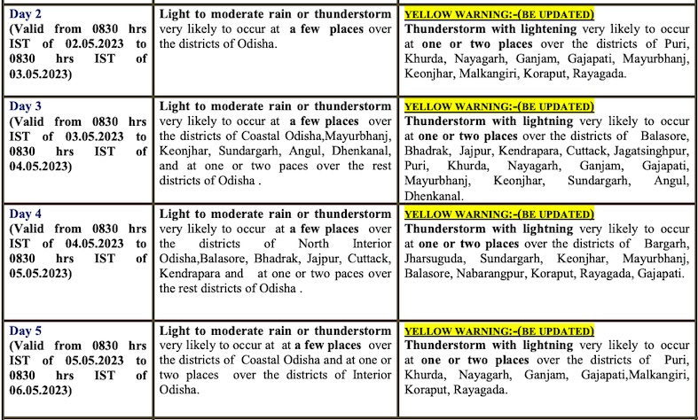 Meanwhile, IMD has issued orange warning for thunderstorm with lightning, gusty surface wind speed reaching 30-40 kmph and heavy rainfall in some places in Malkangiri, Koraput, Rayagada and Gajapati till 8.30 am on Tuesday. Thunderstorm with lightening , gusty surface wind speed reaching 30-40 kmph is also likely at one or two places in Angul, Mayurbhanj, Keonjhar, Deogarh, Balasore, Bhadrak and Jajpur during this period with light to moderate rain at few places across the state.