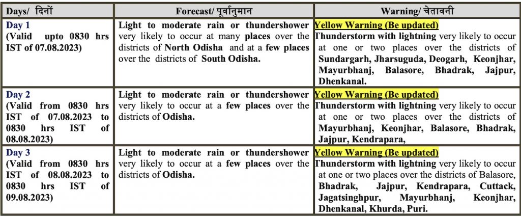 While there is no warning thereafter, light to moderate rain or thundershower may occur at a few places across Odisha during the next 2 days.