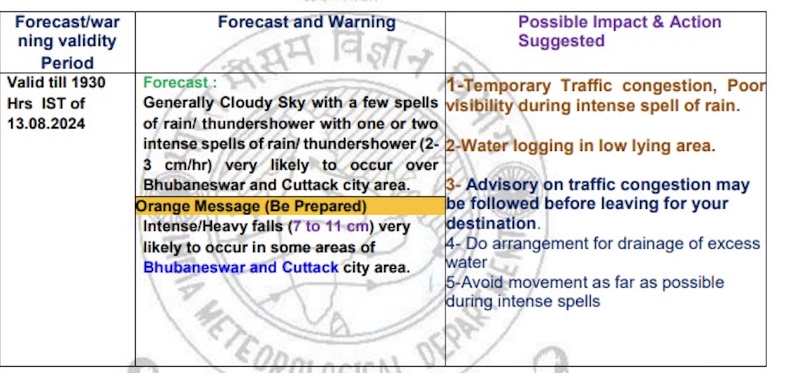 Bhubaneswar: The regional centre of India Meteorological Department (IMD) has sounded orange warning for Odisha’s twin cities of Bhubaneswar and Cuttack till 7.30 pm on Tuesday.