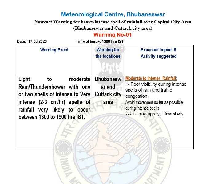 The twin cities of Bhubaneswar and Cuttack are likely to experience one or two intense to very intense spells of rain till 7 pm. The IMD has warned of waterlogging in low-lying area, and occasionally poor visibility and traffic disruption in urban area likely.