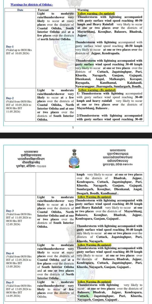 It said thunderstorm with lightning accompanied by gusty surface wind speed reaching 40-50 kmph and heavy rainfall is likely to occur at some places of Mayurbhanj, Keonjhar, Balasore, Bhadrak, and Jajpur during the next 24 hours.