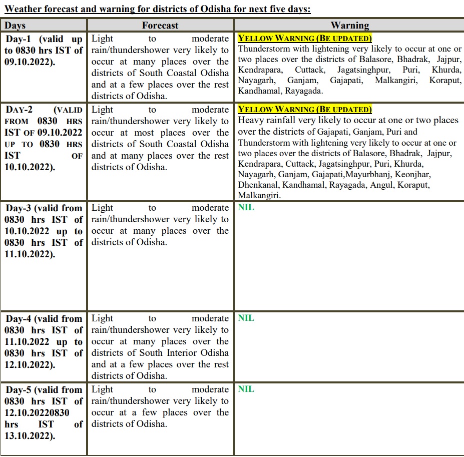 According to its midday bulletin, a yellow warning for heavy rainfall has been sounded in Gajapati, Ganjam and Puri districts on October 9.