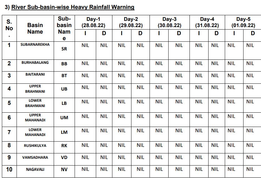 As per QPF categories, rainfall volume in the Upper Brahmani sub-basin is likely to be from 11 mm to 25 mm on Sunday and in Budhabalang, Baitarani and Upper Brahmani areas and on September 1, it said.