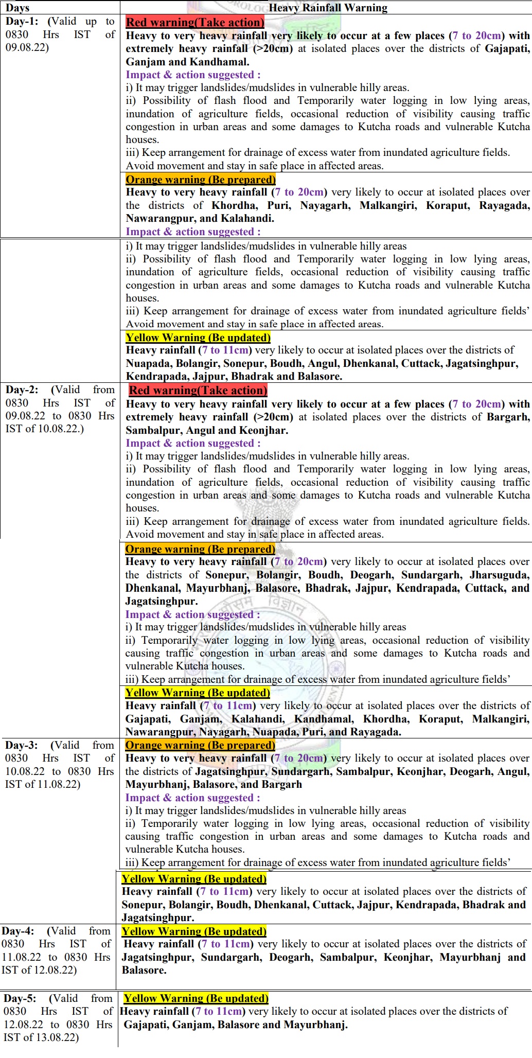 The IMD has issued red warning for the next two days when heavy to very heavy rainfall is very likely to occur over various districts of the state. On August 8, red warning has been issued to Gajapati, Ganjam and Kandhamal districts and the same has been sounded to Bargarh, Sambalpur, Angul and Keonjhar districts on August 9.