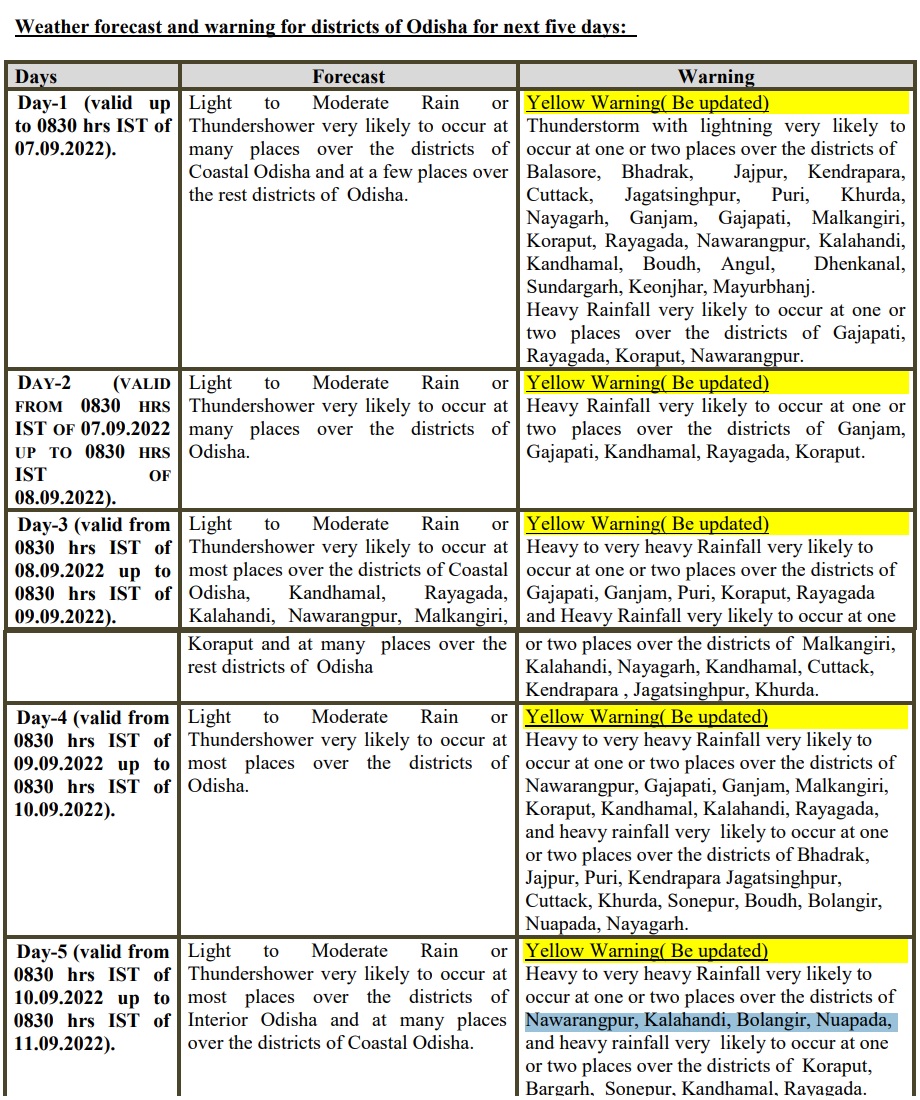 Likewise, heavy to very heavy rainfall warning has been issued to Nabarangpur, Kalahandi, Balangir, Nuapada from 8.30 am of September 10 till 8.30 am of September 11.