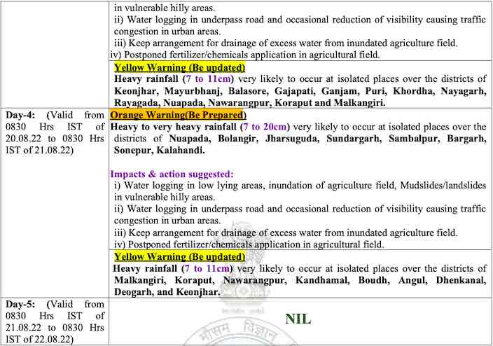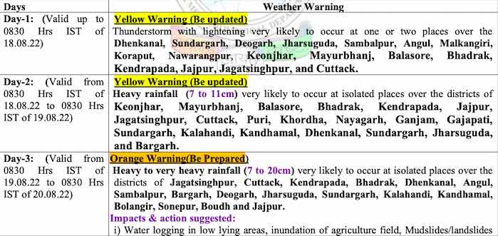 On August 18, heavy rainfall (7 to 11cm) is likely at isolated places in Keonjhar, Mayurbhanj, Balasore, Bhadrak, Kendrapada, Jajpur, Jagatsinghpur, Cuttack, Puri, Khurda, Nayagarh, Ganjam, Gajapati, Sundargarh, Kalahandi, Kandhamal, Dhenkanal, Sundargarh, Jharsuguda, and Bargarh.
