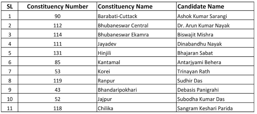 Meanwhile, the Aam Aadmi Party (AAP) has declared candidates for 11 more assembly seats in Odisha, taking it MLA candidates tally in the upcoming elections to 48.