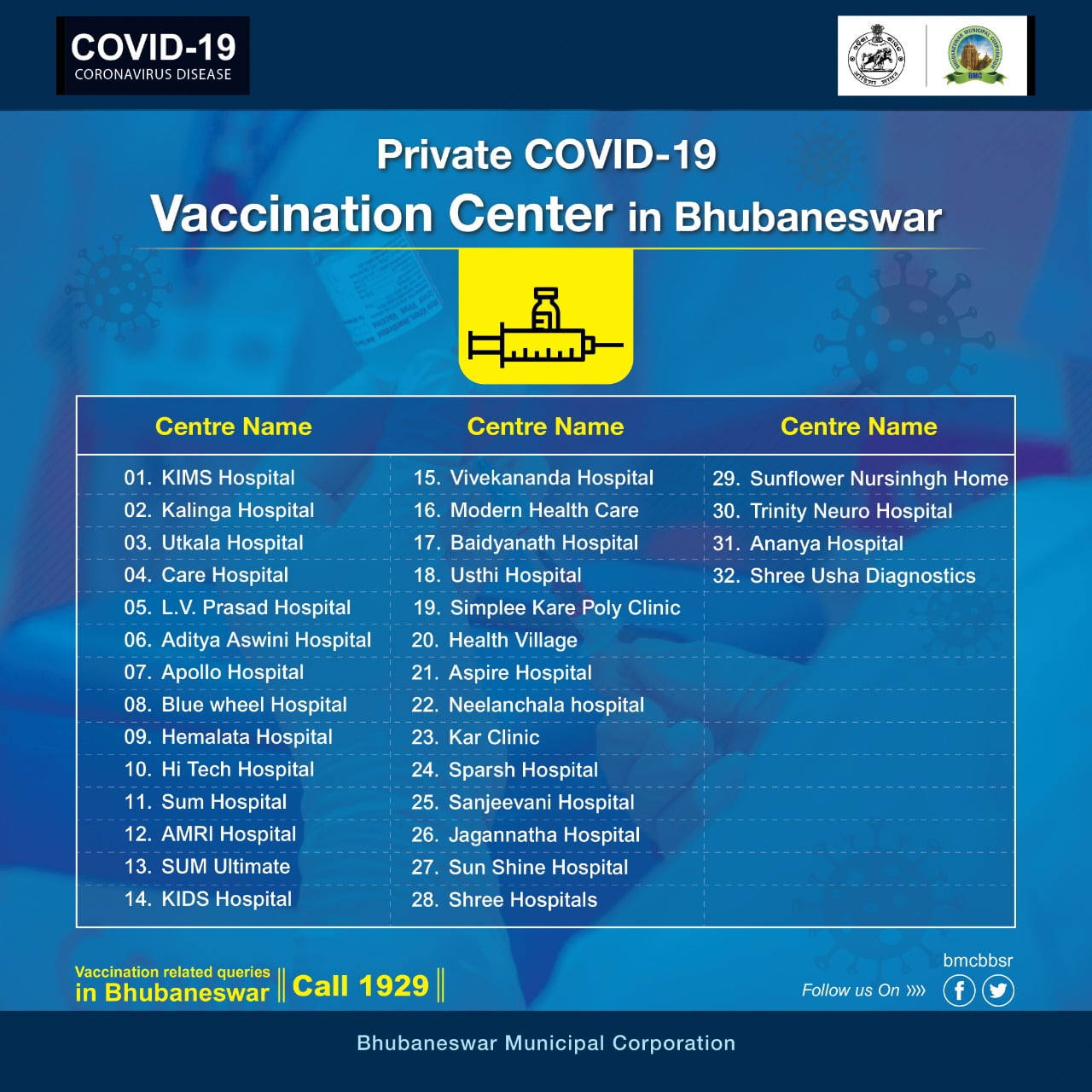 Bhubaneswar: The Bhubaneswar Municipal Corporation (BMC) has issued a list of government and private COVID-19 vaccination centres in the Odisha capital.