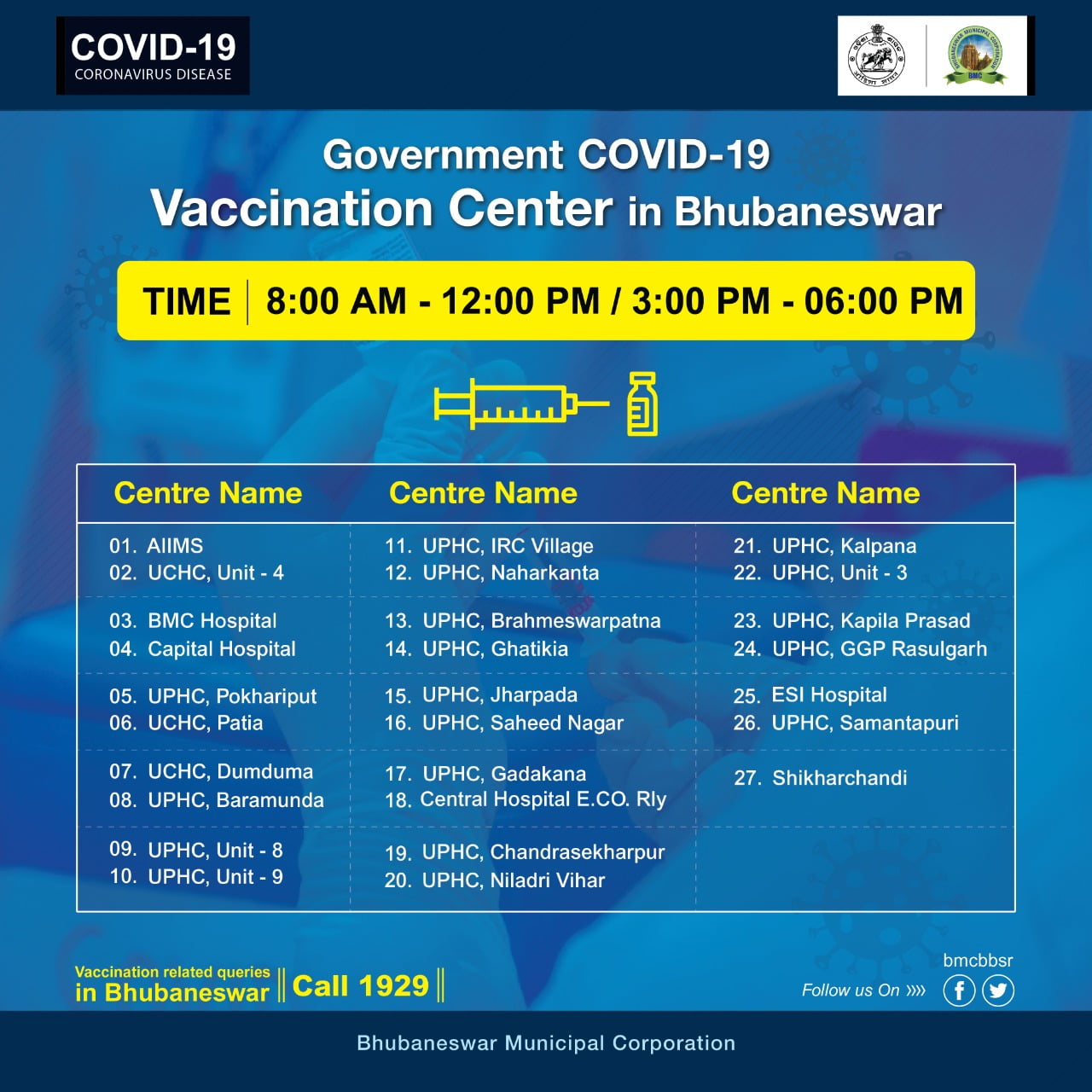 Bhubaneswar denizens aged 45 years and above can take vaccine jabs at these centres as per the time table.