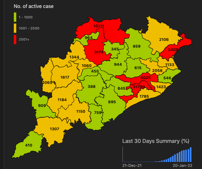 Currently, 19 districts are in RED zone with positivity rate above 7.5 per cent. Till Januray 19, Sundargarh had the highest positivity rate of 32.7 per cent, followed by Khurda at 31.8 per cent.