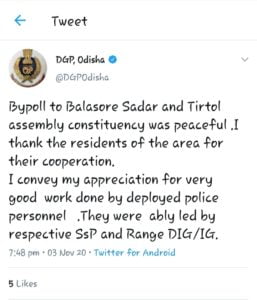 Director General of Police Abhay in a tweet said the bypolls were peaceful and thanked the people and police for it.