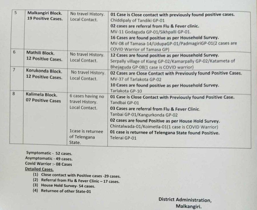 The highest of 34 cases have been reported from Malkangiri municipality, followed by 19 from Malkangiri block, 12 each from Korukonda and Mathili block, seven each from Khoriput and Kalimela, six from Chitrakonda block, four from Balimela NAC.