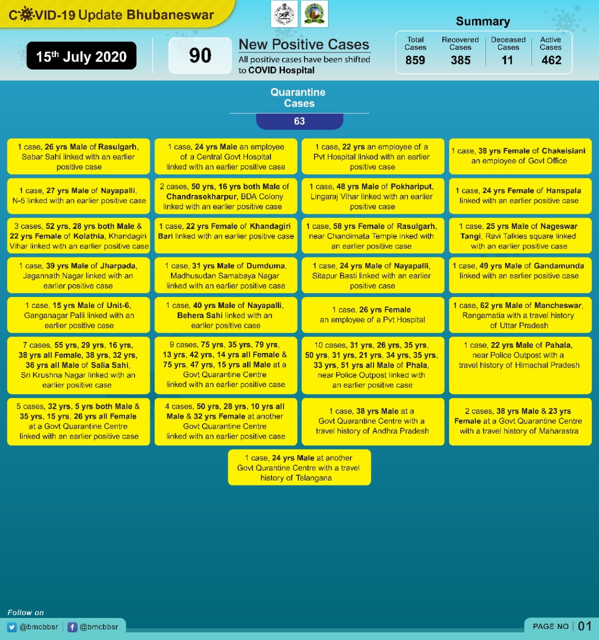 Among them, 63 are quarantine and 27 local contact cases. The 90 are among the 107 new cases detected in the Khurda district.