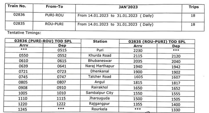 Puri-Rourkela Special will leave Puri at 5.15 am on all days from January 14 to 31, with stoppages at Khurda, Bhubaneswar, Dhenkanal, Talcher, Angul, Rairokhol, Sambalpur, Jharsuguda, Rairangpur and Rourkela, where it will arrive at 12.45 pm.
