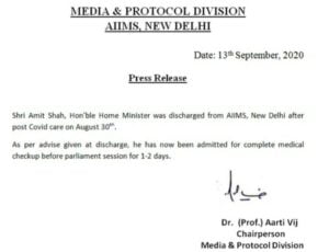 According to a press release from AIIMS, the home minister was advised a complete checkup at the time of his discharge on August 31.